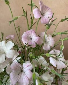 Delicate 1-2 inch, blush pink flowers that fade to white as they mature. They’re on long slender, silvery gray stems that sway in the breeze. Creating a whimsical , airy, cottage garden feel, they grow to be about 2-4 feet tall. Great to add movement to bouquets and arrangements.