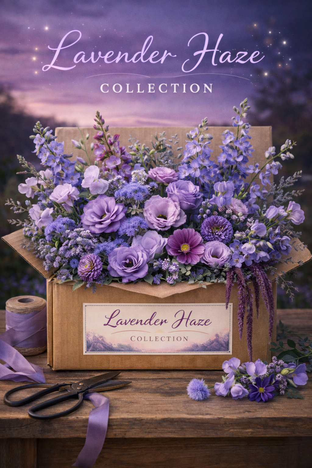 Delphinium Pacific Giants (3 – Perennial), Sweet Pea Pulsar (3), Sweet Pea Blue Ripple (3), Sweet Pea Wiltshire Ripple (3), Ageratum (4), Snapdragon Lavender (3), Amaranth Pygmy Torch (4), Lisianthus Chateau Blue (3), Lisianthus Lavender (3)