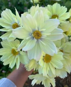 Award winning compact cosmo known for its unique soft pastel yellow to butter yellow blooms with green undertones. It is the first true yellow cosmo with airy foliage, early season flowering, and a long bloom time. Grows to be about 2 feet tall and is good for small spaces in your garden. Single 2-2.5 inch blooms with ruffled petals, great at attracting bees and butterflies. Deadhead to encourage more blooming.