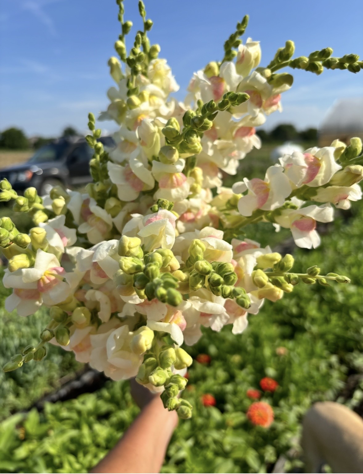 A classic, tall annual with bicolor blooms, featuring creamy white petals coupled with soft blush pink or rose accents. This variety creates an air brushed look. Sturdy spikes with a velvety texture. You can get a second flush of these in the fall if you cut them in early summer. They have a sweet, old fashioned aroma that is quite nostalgic. The foliage is Granny Smith apple green and is long lasting as a cut flower.