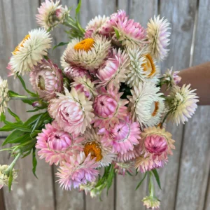 Starburst papery blooms in a light dusty rose and white shade. These work great as a cut flower or dried flower. Cut and come again these are a great addition to any garden.