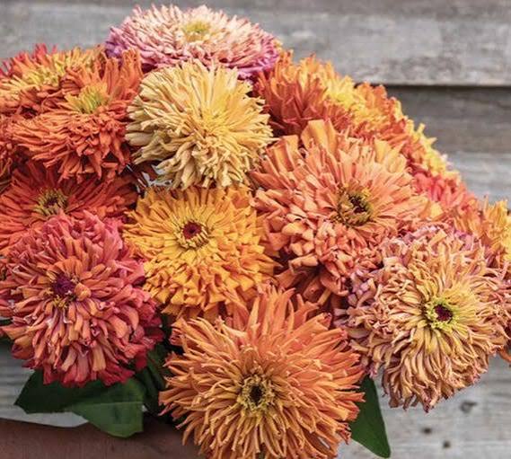 large 4-6″ double cactus blooms featuring quilled, twisted petals n shades o peach, coral, apricot, pink, and gold. Ombre and vibrant!